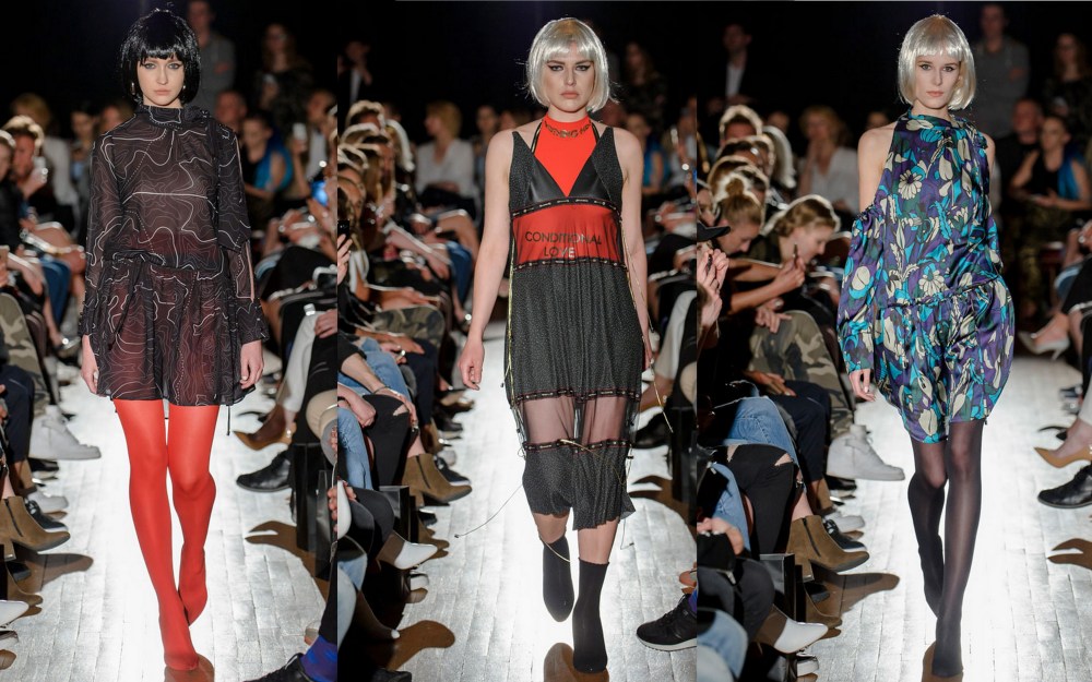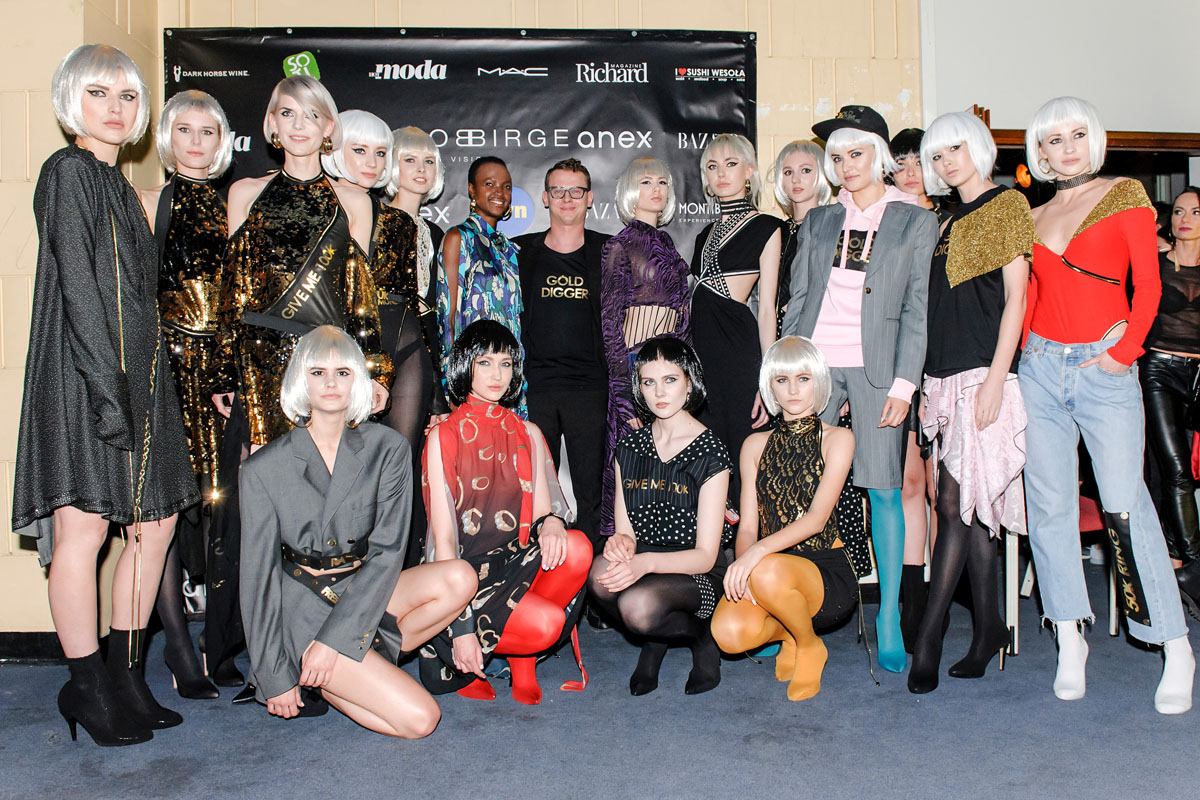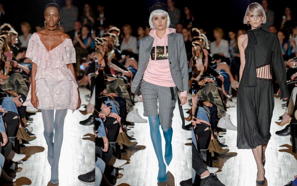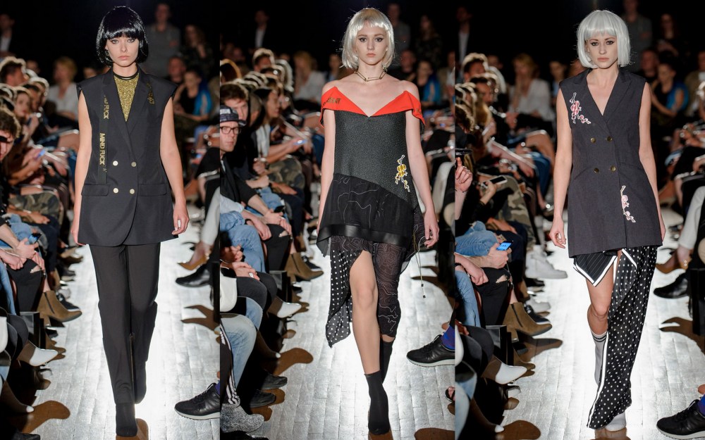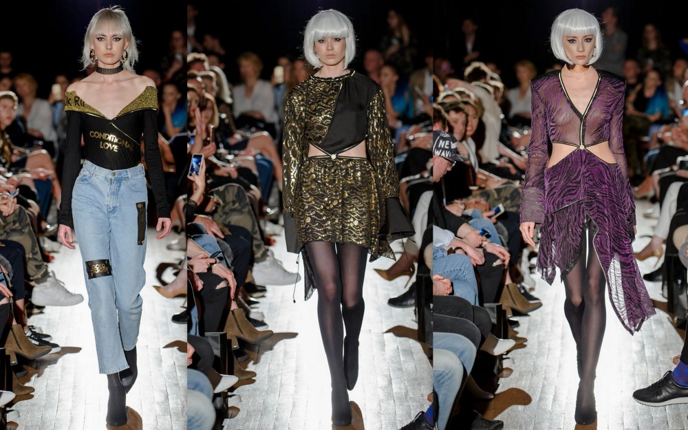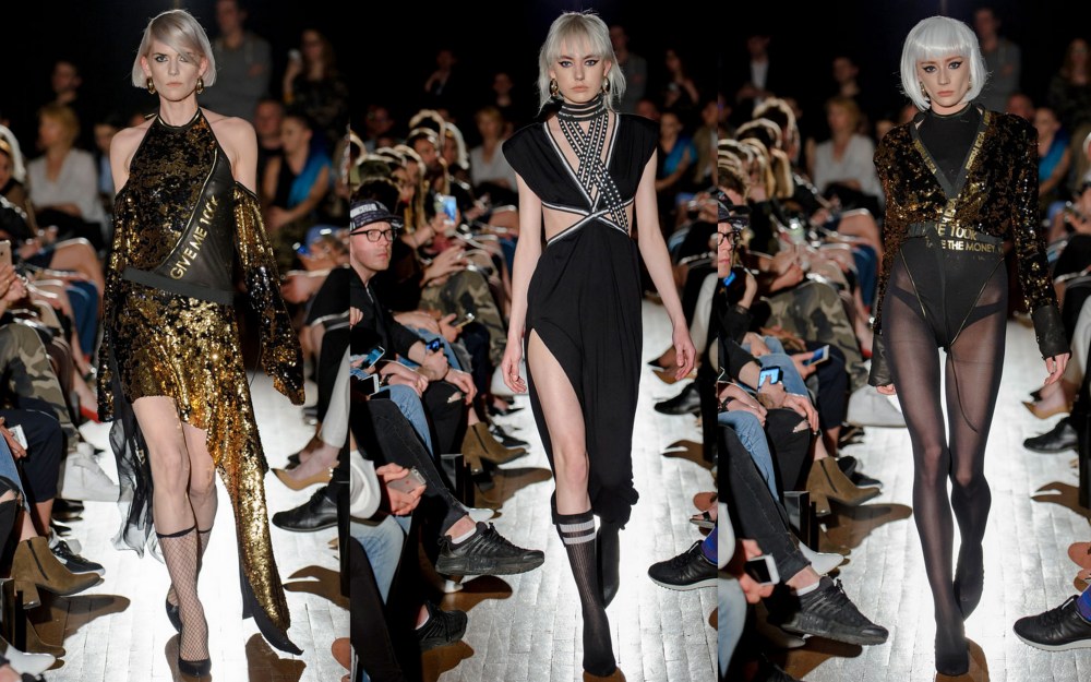 W kolekcji stworzonej z rozmachem możemy zobaczyć wiele kolorów takich jak złoto, czerń, fiolet czy cekiny. Nie brakuje też w sukienkach stylu retro przełamania, butów połączonych ze skarpetkami, w jaskrawych kolorach czerwonego, niebieskiego czy żółtego. Ewidentnie widać tutaj inspirację kolekcji Balenciagi. Osobiście zachwyciły mnie prześmiewcze PRINTY z cytatami „GIVE ME 100K”, „50K RING”, „PAY MY RENT”, które podkreślają naszą bohaterkę „blaharę”. Jestem przekonany, że te hasła staną się hitem. Mocny makijaż, sztuczne peruki na modelkach, zestawione z miksowaną muzyką elektroniczną/techno wpisały się w konwencję tragifarsy gold digger.