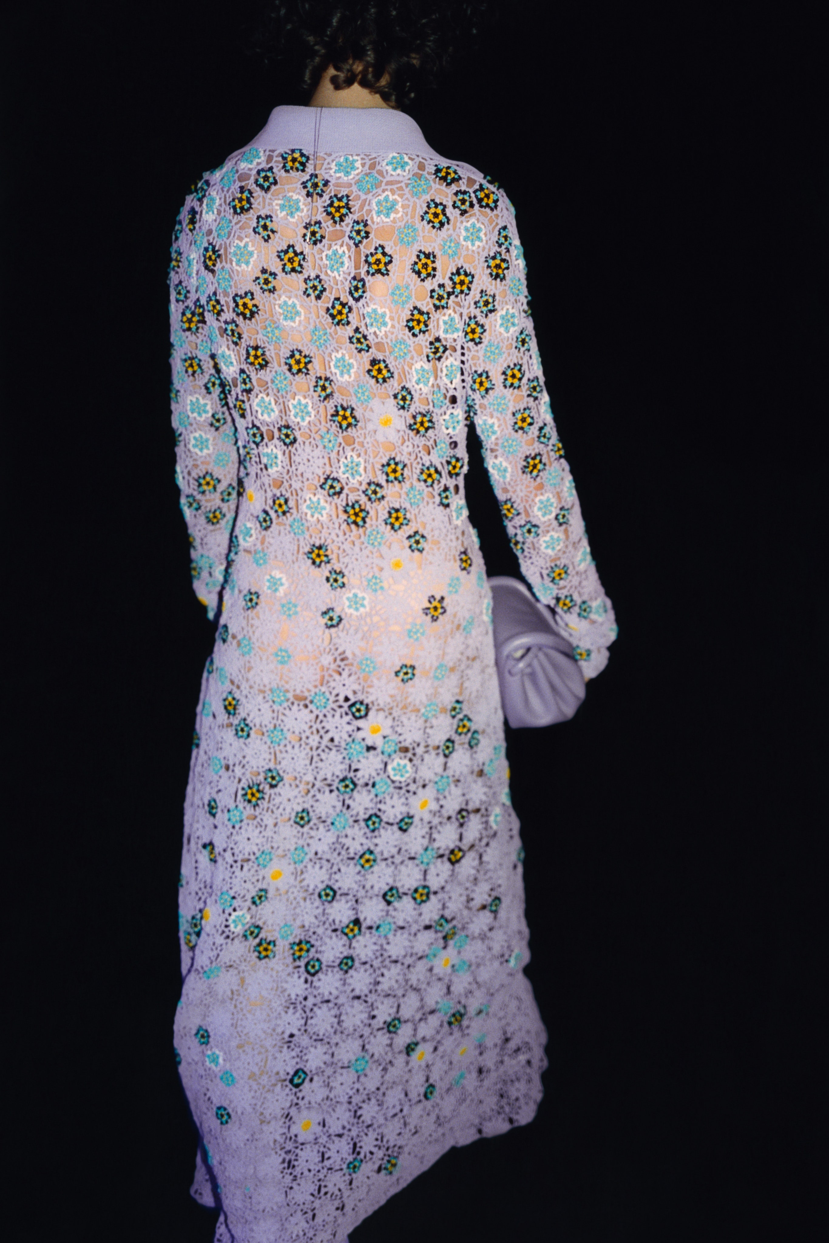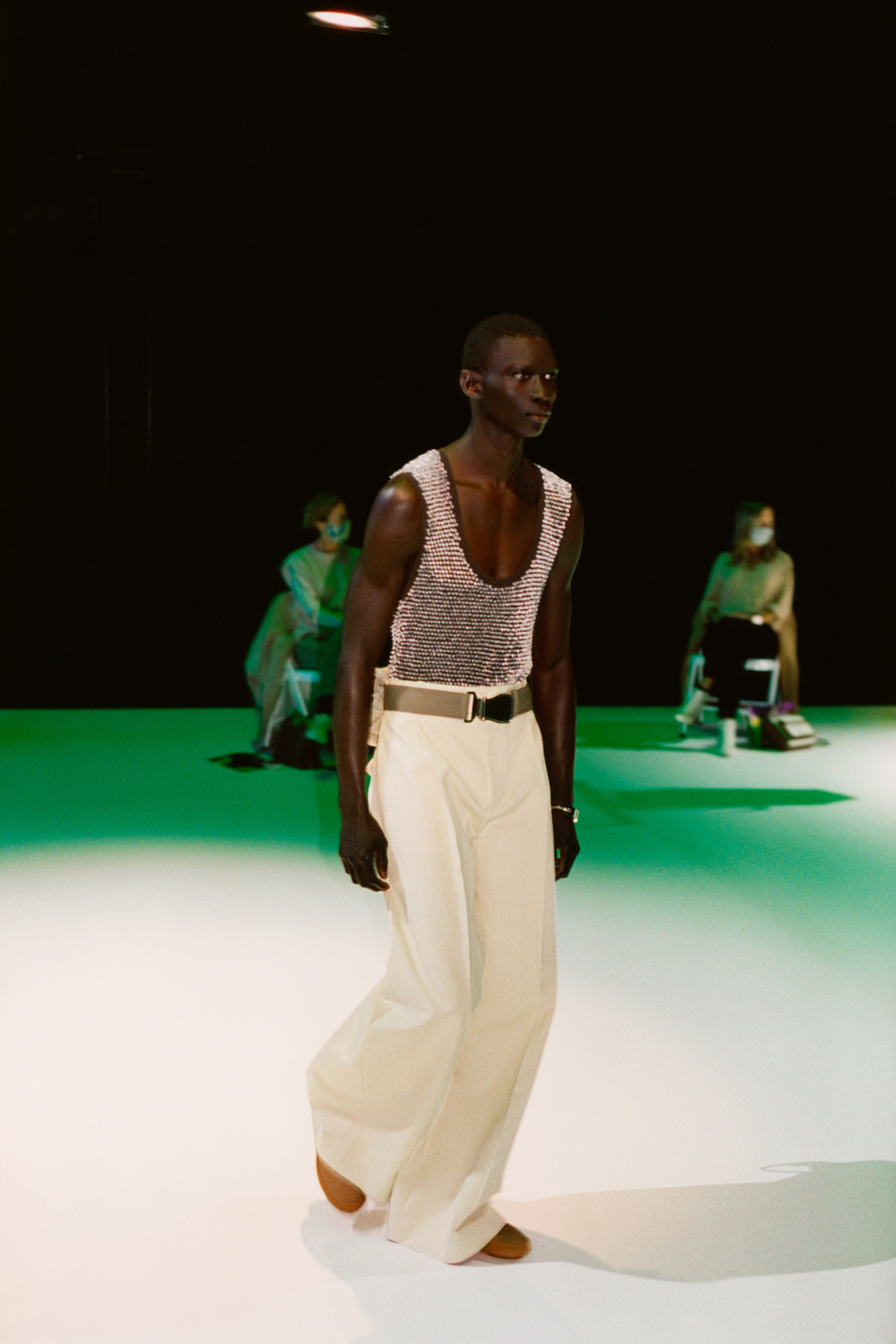 Myśląc przede wszystkim o produkcie, to przesłanie towarzyszyło Danielowi Lee do stworzenia najnowszej kolekcji na wiosnę 2021 roku. Wirtualna rzeczywistość według intuicyjnych, analogowych obrazów całkowicie wygrywa. Jak większość projektantów, Lee musiał dostosować się do aktualnej rzeczywistości i zastanowić się jak moda ma wyglądać w panującym kryzysie. Najlepszym sposobem okazało się zatracenie w tworzeniu pięknej tkaniny i odzieży. Jeśli zastanawiacie się jak można wyglądać elegancko, a jednocześnie czuć się komfortowo to wystarczy spojrzeć na najnowszą kolekcje Bottega Veneta. Rękodzieła w stylu domowym tak jak szydełkowały nasze babcie możemy zobaczyć na swetrach i sukienkach bez rękawów. Zdeformowane sylwetki w zabudowanych sukienkach na biodrach z wyściółką. A także elementy, które zwykle znajdują się pod powierzchnią, tym razem stanowią charakterystyczne detale ubrań. Do ich stworzenia projektant zainspirował się Henrykiem VIII za czasów Tudorów. Jestem przekonany, że będą one must-have, w nadchodzącym sezonie dla miłośników mody. Skóra, która stanowiła DNA marki tym razem nie grała głównej roli. Mogliśmy za to zobaczyć grę różnych materiałów. Moją uwagę przykuły sukienki wykonane w całości z koralików samochodowych lub maleńkich odłamków perłowych muszelek. Nie jest tajemnicą, że Daniel Lee studiował dzianinę w Central Saint Martins i genialnie wykorzystał swoje umiejętności przy pracy z tym materiałem. Tak jak w poprzedniej kolekcji, w tym sezonie króluje dotyk. Patrząc na zaprezentowane sylwetki, aż by się je chciało ubrać i dotknąć. W pokazie zdecydowanie widać zabawę formą. Pojawiła się wyściełana skóra użyta do wykonania bluzki i spodni, a także wyżej wspomniane szydełkowanie.